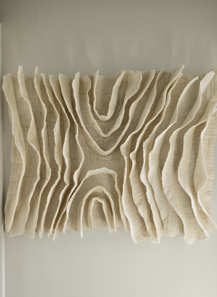 De basis van deze wandkleden is handgemaakt wolvilt gemaakt van Nederlandse- of Europese wol, soms met toevoegingen van bijzondere schapenvacht en zelf geverfde wol.