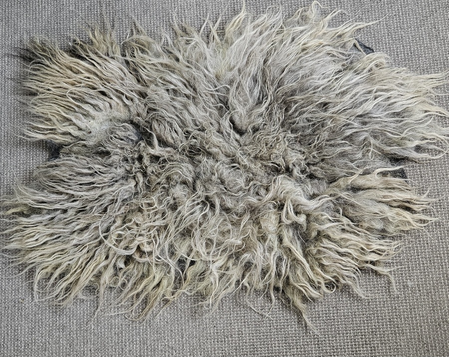 Een schapenvacht met lange lokken op stevig grijs wolvilt.