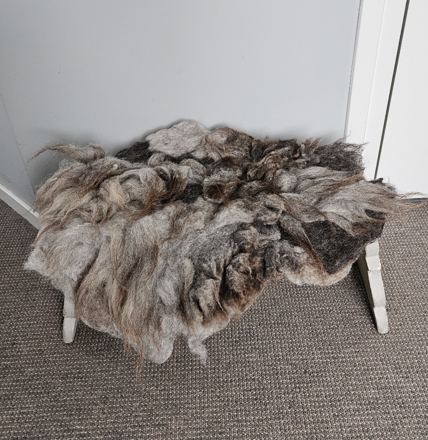 Een handgemaakt vachtkleedje met vachtwol van een heideschaap.
